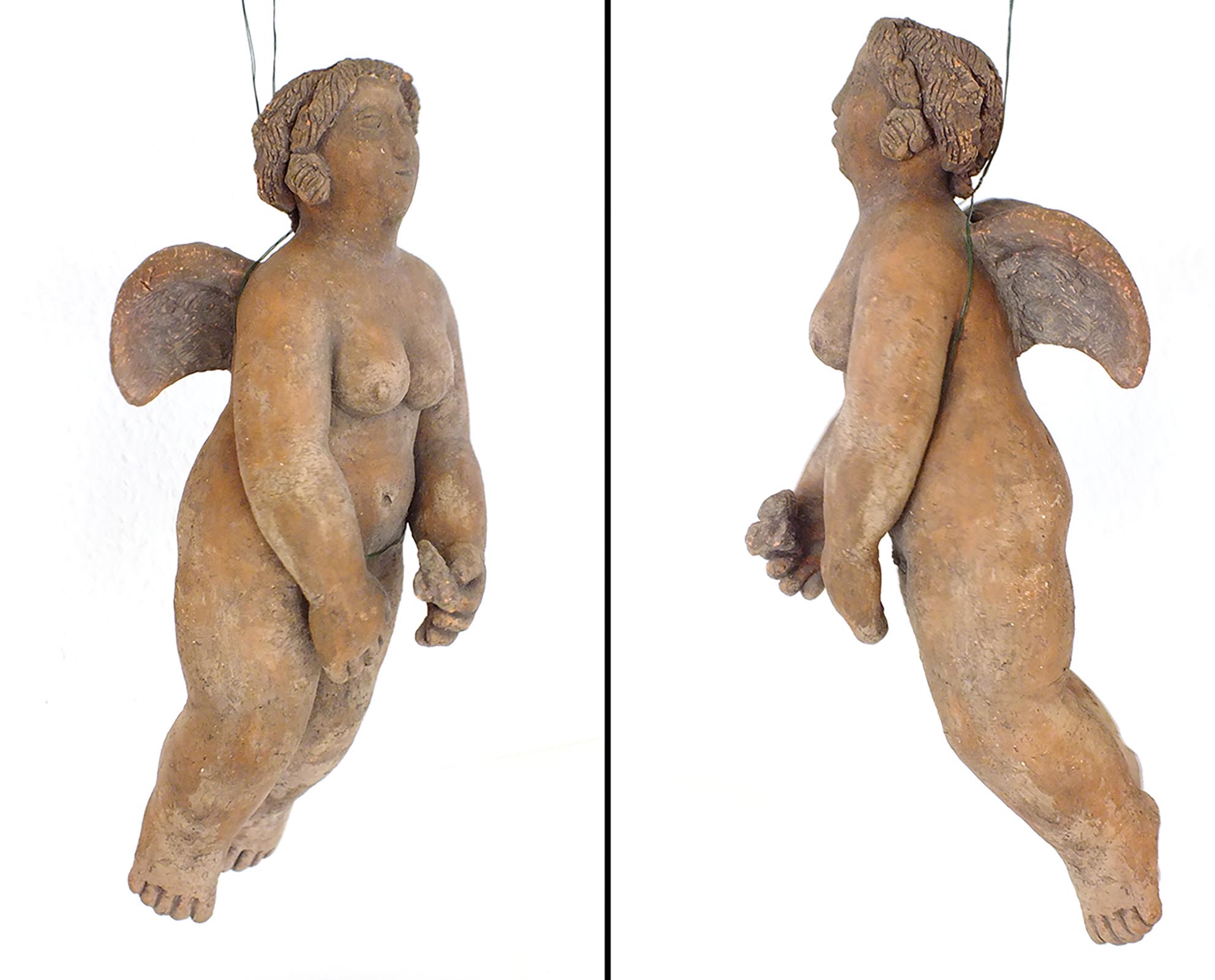 Terrakotta, Ende der 1970er Jahre, Höhe: 520, Breite: 190, Tiefe: 250, Rot/Braun patiniert. Der Künstler, für seine einzigartigen Illustrationen (meist Holzschnitte) zu Märchen bekannt und geliebt, schuf auch Holzskulpturen zu meist naiven Themen, die er bemalte. Terrakotten, in typischer Sellscher Manier, sind eher die Ausnahme. Die an der Zimmerdecke drapierte, schwebende Figur war ein Glücksbringer der bisherigen Eigentümer. Selten! |